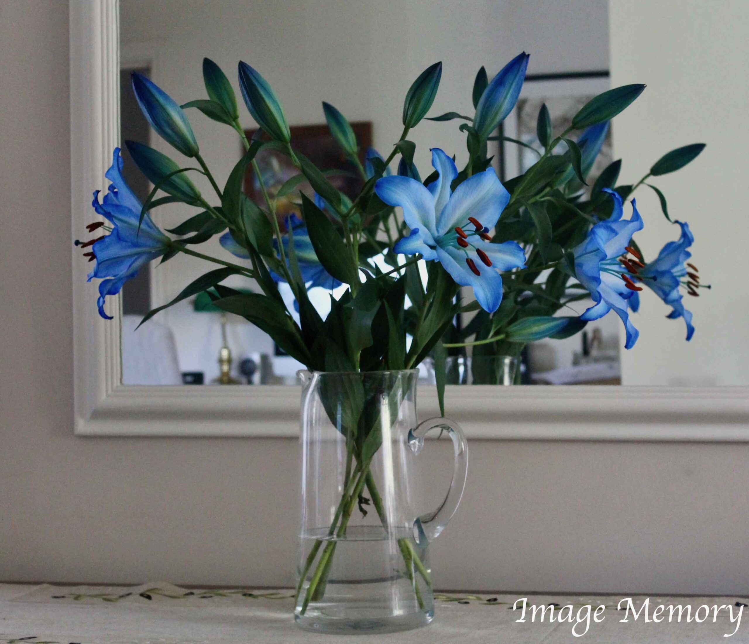 The lilies stand out against the background as the afternoon sun shining in. Available as a greeting card or print.